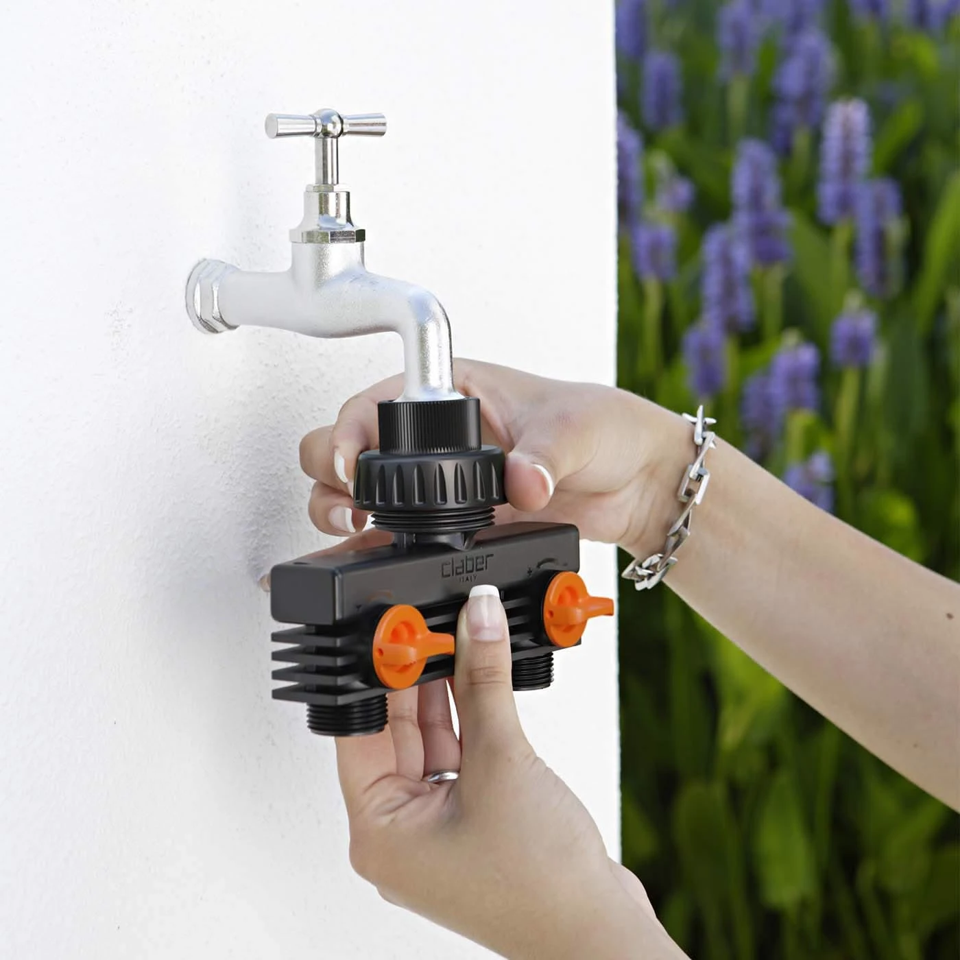 The Claber Two Way Tap Adaptor is the perfect addition to the garden for convenience. Ideal for garden watering systems as it allows a water timer to be installed on one outlet, whilst leaving another free for a garden hose, filling up the water can or washing the car. Designed for taps with a 3/4″ BSP thread (standard tap size). Easy installation, just screw it straight on. Made from high quality plastic for a long-life, this is a seriously tough piece of kit, and can match a brass tap splitter any day.