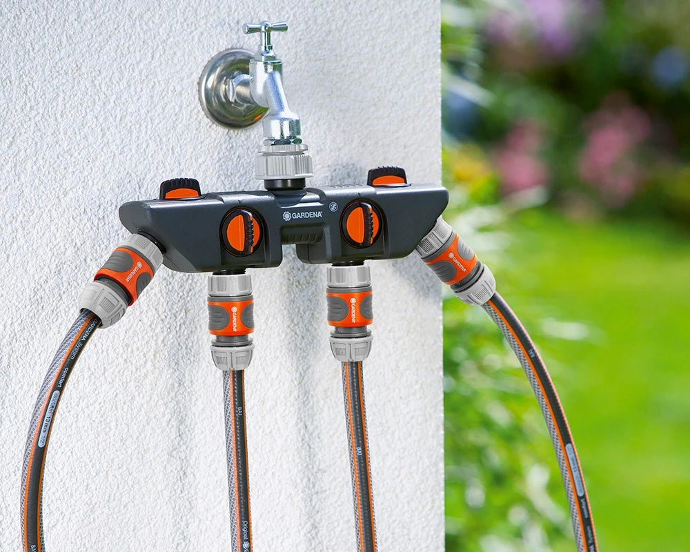 The Gardena Four-Channel Tap Connector is an excellent accessory for busy gardeners that want to irrigate several areas in the garden. Using this 4-Channel Water Distributor, you can connect up to four devices at once from a single tap. Each outlet has an independent flow control making it easy to switch from one outlet to another.