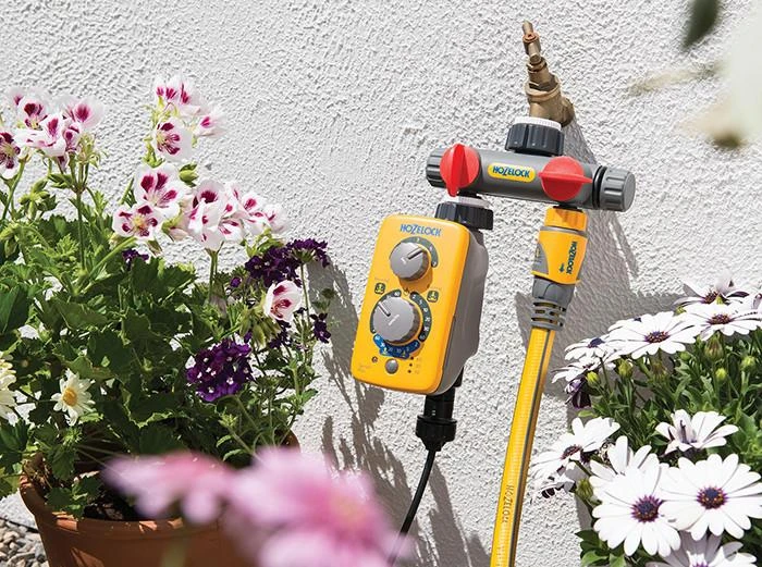 - The twin outlet tap connector fits directly to an outdoor garden tap.